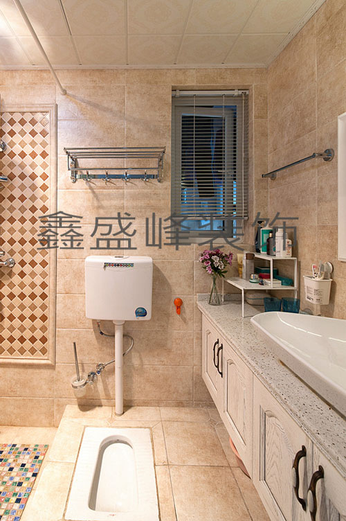卫生间:墙地砖(南巷口建材城惠达瓷砖),洗手盆定做,门板开放漆,台面大理石,绿岛建材城樱花集成吊顶。
