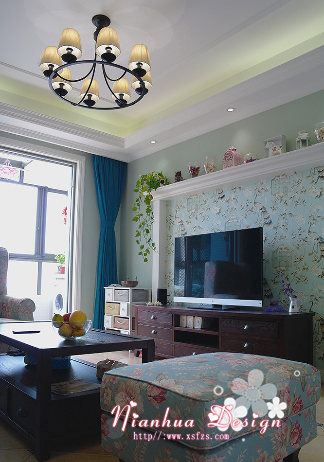简单的电视墙造型,独特的电视背景壁纸,英式田园的组合沙发,