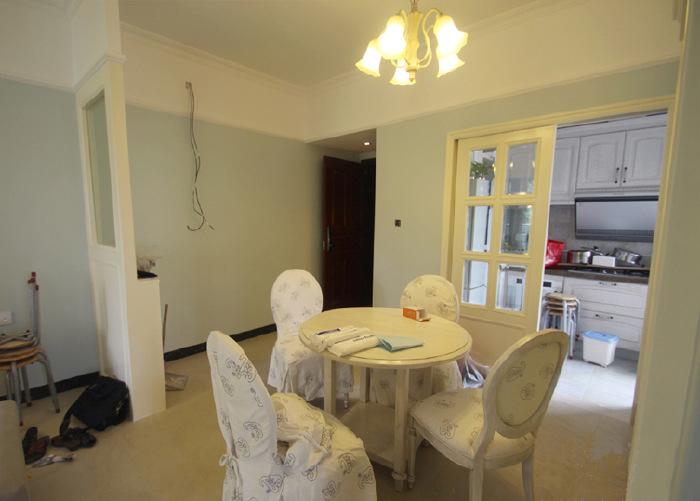 家具进场,四座小圆形白色韩式餐桌,