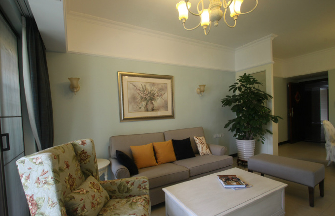 比较舒服的小组合沙发,给人感觉很清新,浅咖色主色调,搭配花布靠椅单座沙发,混油白色小茶几,添加一些绿植,很有感觉的。